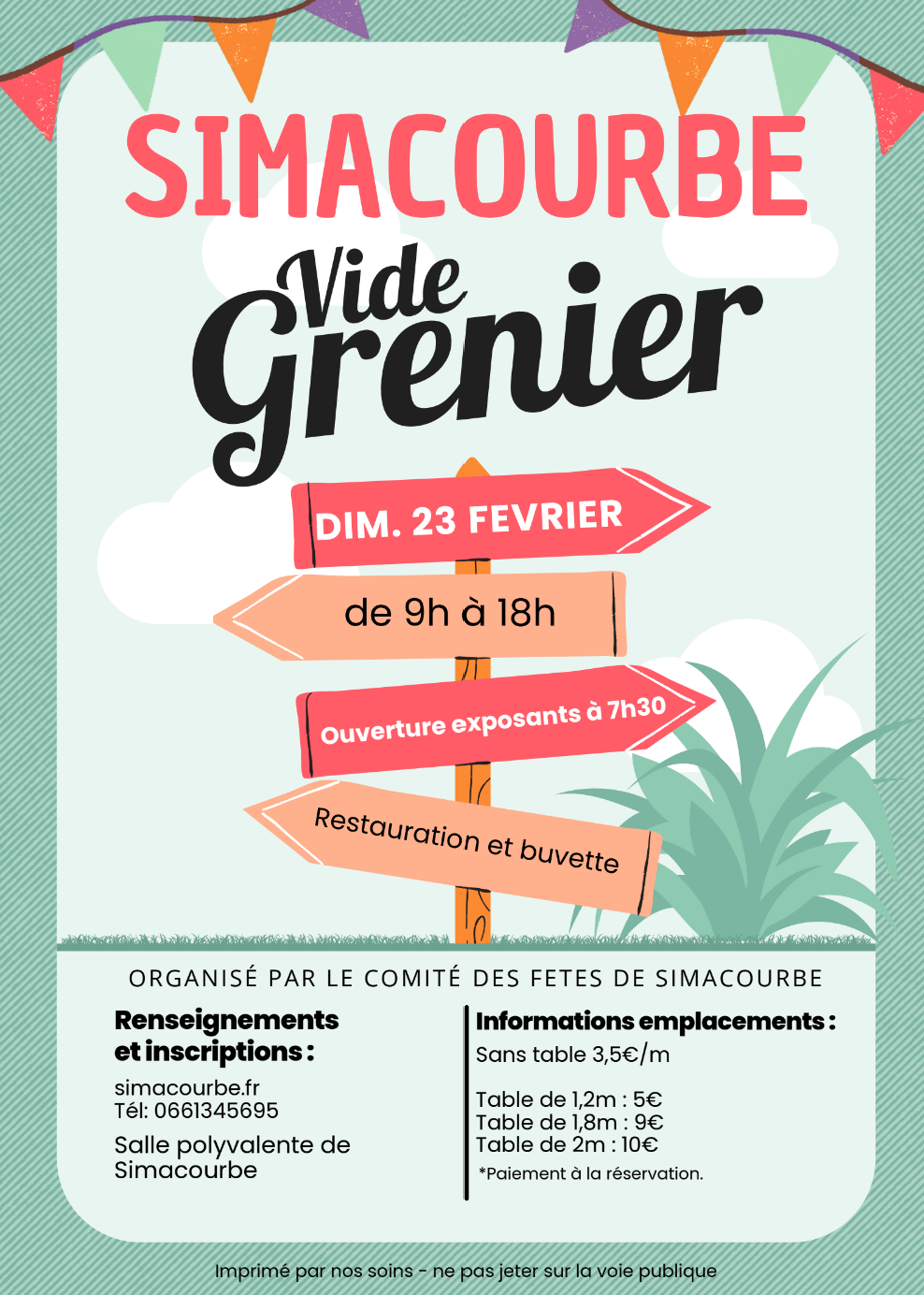 Le Comité des Fêtes de Simacourbe organise un vide grenier à la salle polyvalente de Simacourbe, le dimanche 23 février. Pour vous inscrire, v ous avez la possibilité de télécharger le bulletin d'inscription ci-dessous, à renvoyer par courrier avec le règlement, ou par mail par cas de paiement par virement. Pour tout renseignements, vous pouvez contacter le 06 61 34 56 95 .
